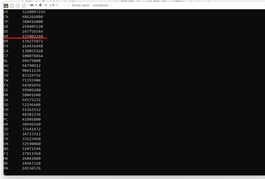 edu8@edu:~$ cat delegated-* | grep -v summary | grep KR | awk -F"|" '$3=="ipv4" && $2!=""{sum+=$5} END{print sum}'