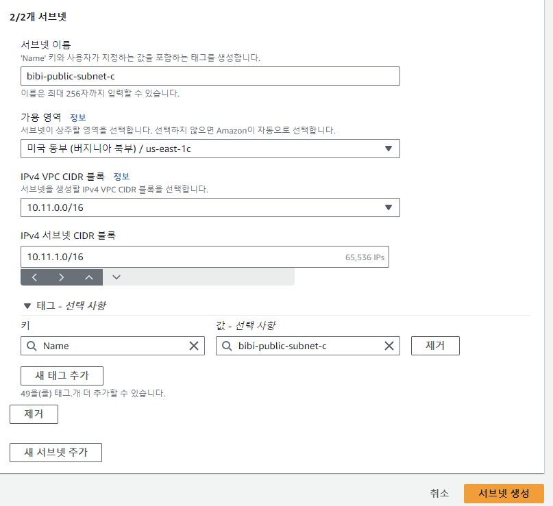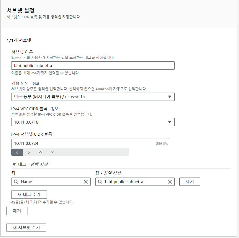 - IPv4 서브넷 CIDR 블록 : 이전 설정했던 VPC의 주소(ex) 10.11.0.0/16) 범위 내에서 설정해준다.