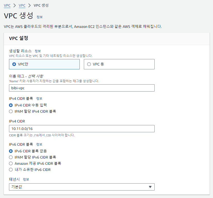 - 생성할 리소스 : 하나씩 직접 구성할것이므로 'VPC만' 을 선택함