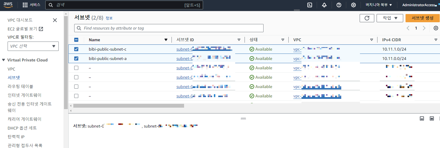 - 두번째 서브넷 설정도 끝났다면 최하단의 서브넷 생성 버튼을 눌러 생성을 완료해준다.