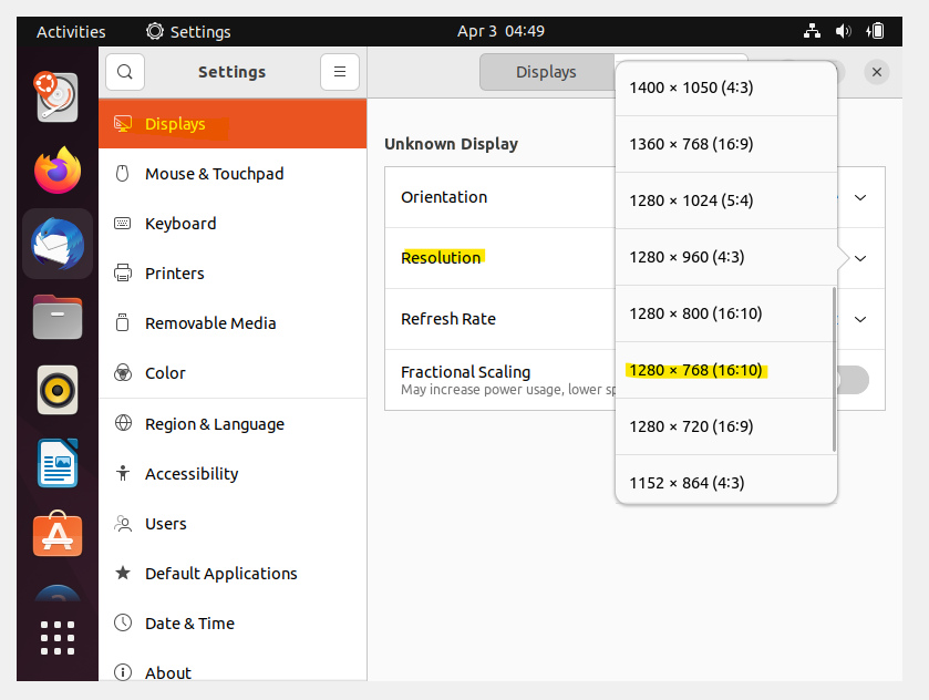 * Displays -> Resolution -> 1280 x 768 (16:10) 선택 -> Apply 버튼 클릭 -> Keep Changes 클릭